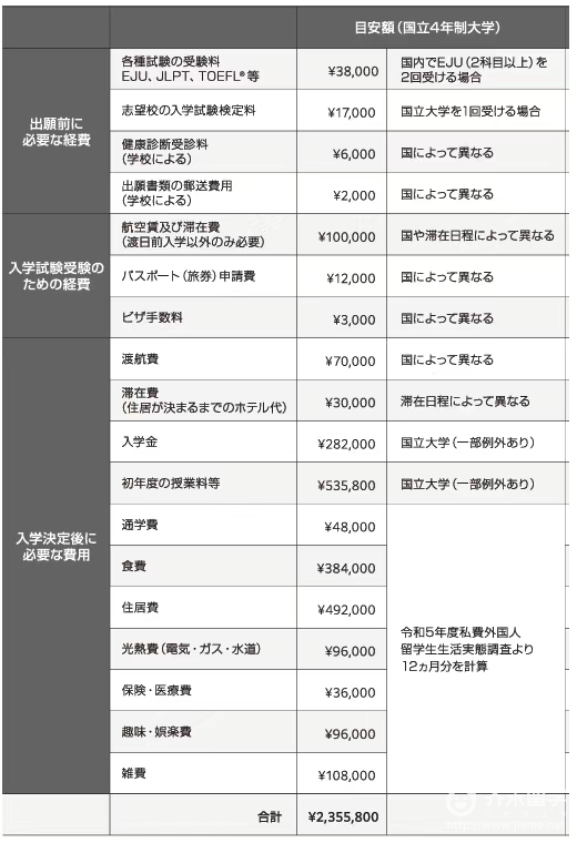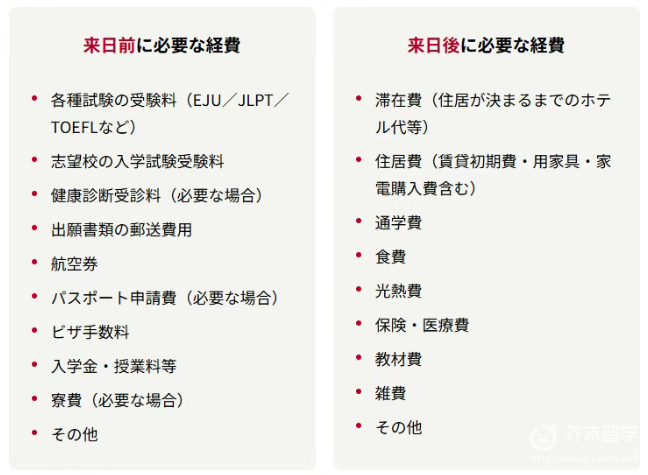 赴日前后除了学费、生活费,还会产生其他的费用,大家可以参考如下: