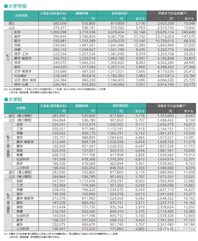 公立大学首年为91万日元(4.1万人民币),之后是54万日元(2.5万人民币);