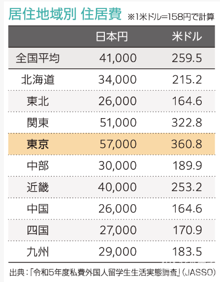关于居住费,全国平均的居住费是41000日元(1900人民币),而东京是57000日元(2600人民币)。