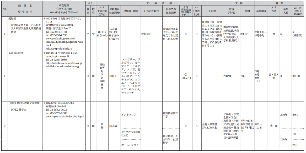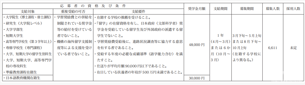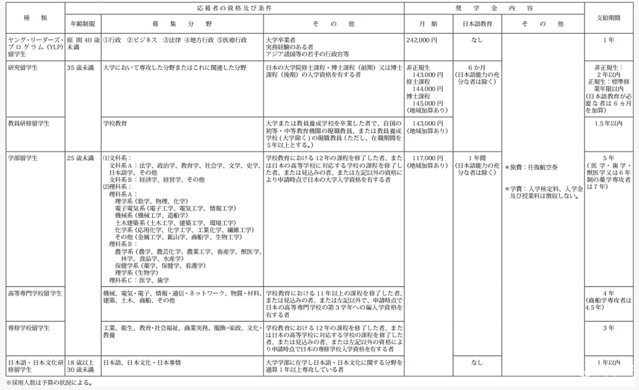 分为促进留学生接纳计划和海外留学支援制度,部分奖学金参考如下: