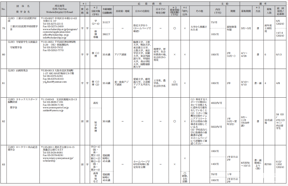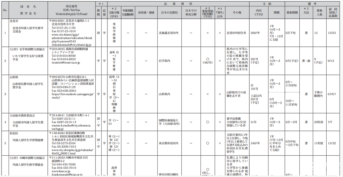 日本的奖学金包括:文部省奖学金、日本学生支援机构奖学金、地方自治体奖学金、民间团体奖学金、赴日前录用奖学金。
