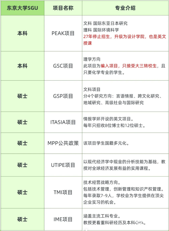 🔹PEAK项目分为文科的国际东亚日本研究(PEAK--International Program on Japan in EastAsia) 理科的国际环境科学(PEAK-International Program on Environmental Sciences)